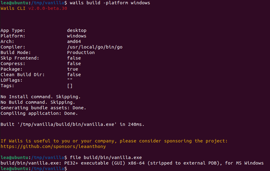 Para abordar esta questão na v3, gostaria de passar para um sistema de construção que existe fora das Wails. Depois de usar Tarefa por um tempo, eu sou um grande fã dela. É uma ótima ferramenta para configurar sistemas de construção e deve ser razoavelmente familiar para qualquer um que tenha usado Makefiles.
